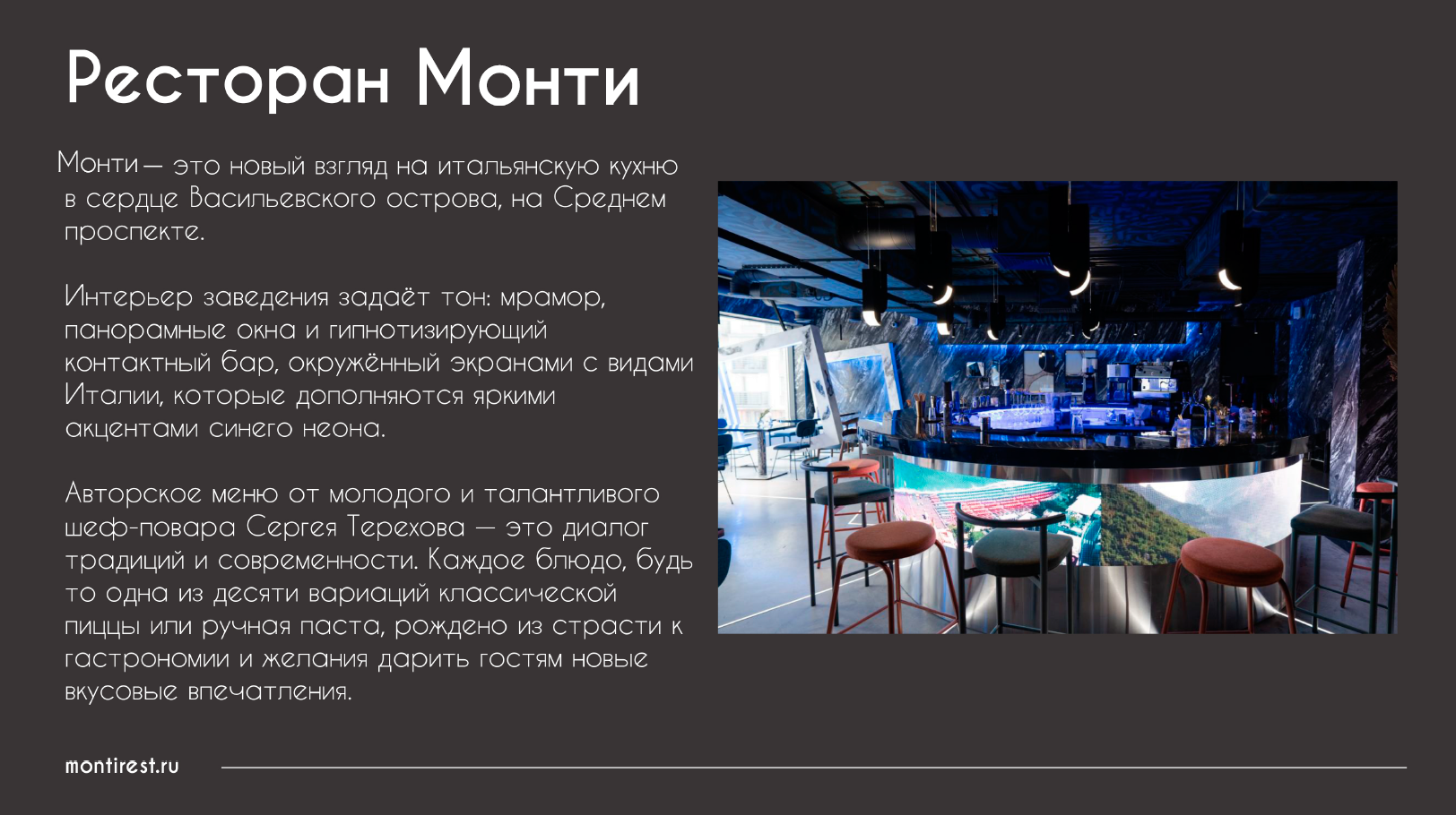 В интерьере Монти мрамор, яркий синий неон, панорамные окна в пол и гипнотизирующий контактный бар, который оснащён экранами по всему периметру, транслирующим удивительные виды Италии